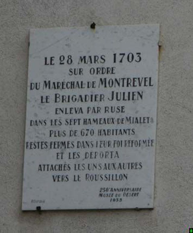 Après la révocation de l'Edit de Nantes, le pouvoir royal qui voulait éradiquer la religion protestante fit payer un lourd tribut aux habitants de Mialet. Sous la pression des dragons du Roi, une grande partie des protestants de Mialet abjurent devant le prieur. Cette conversion n'est qu'apparente et c'est le début de la période du "désert" avec les assemblées clandestines dans des lieux écartés pour y célébrer le culte. Plusieurs sont surprises par les dragons et les peines vont de la lourde amende à la condamnation aux galères ou l'exécution. Le 23 mars 1703, 670 personnes restées fermes dans leur foi protestante ainsi que des catholiques les ayant soutenus, furent déportés vers les prisons royales de Perpignan. Sur la façade du temple, une plaque commémore cette sinistre la déportation.